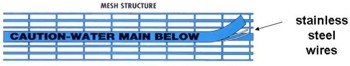 Πλέγμα σήμανσης και προστασίας υπογείων καλωδίων και σωληνώσεων, κατασκευασμένο από υψηλής αντοχής ομοπολυμερές πολυπροπυλένιο, με υψηλό βαθμό αντίστασης στη σήψη, το οποίο έχει ενσωματωμένα μέχρι δύο ανοξείδωτα σύρματα ιχνηλάτησης και με εκτύπωση στην μία πλευρά ενός κειμένου προειδοποίησης. Το πλέγμα κατασκευάζεται βάση προδιαγραφών ΕΝ12613:2009